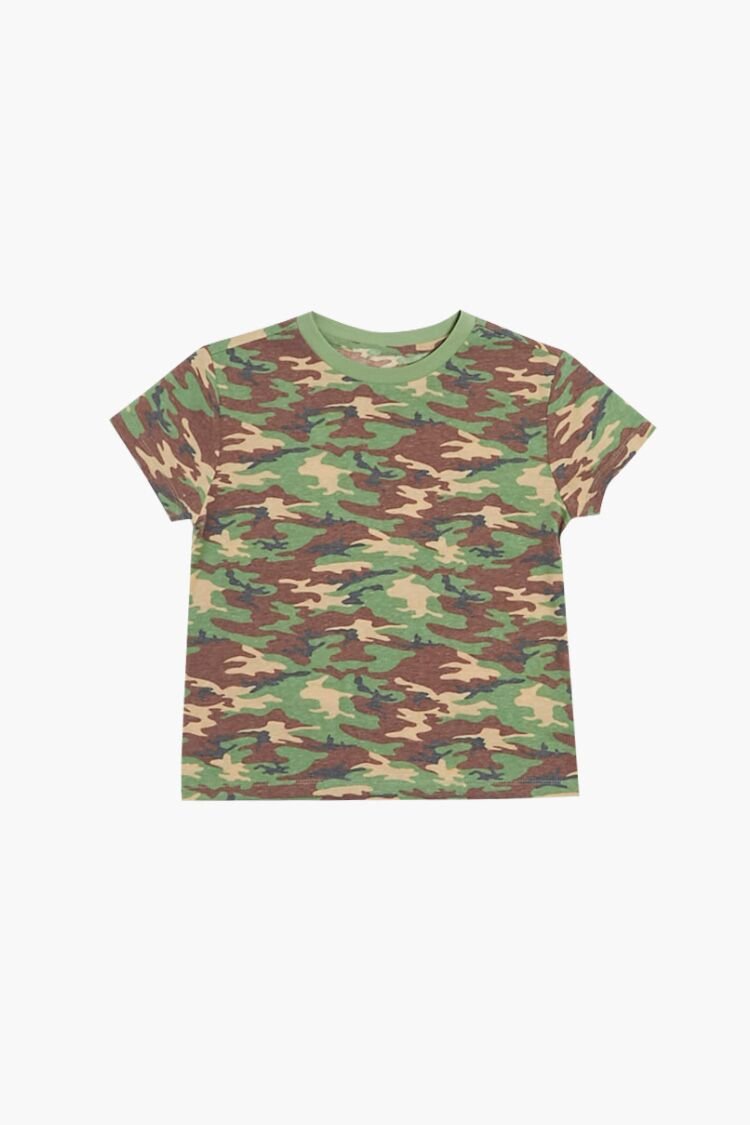 Details A knit tee featuring an allover camo print, ribbed crew neckline, and short sleeves.Content + Care – 62% polyester, 33% cotton, 5% spandex – Hand wash cold Size + Fit – Model is 4’3′ and wearing a Size 7/8