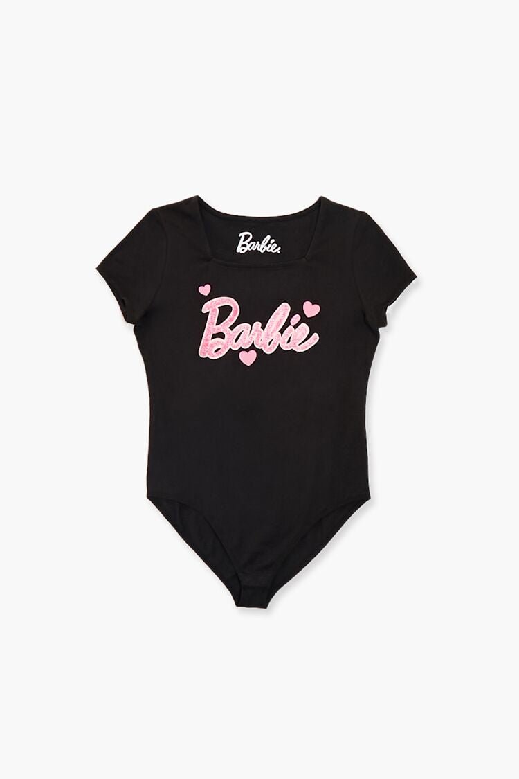 Details Forever 21 Girls – A jersey knit bodysuit featuring a scoop neck, chest ‘Barbie’ glitter text, accompanying heart graphics, and cap sleeves.- Officially licensed product Content + Care – 95% cotton, 5% spandex – Machine wash cold Size + Fit – Measured from a Size 7/8 – Full length: 21.75′ – Chest: 13.5′ – Sleev