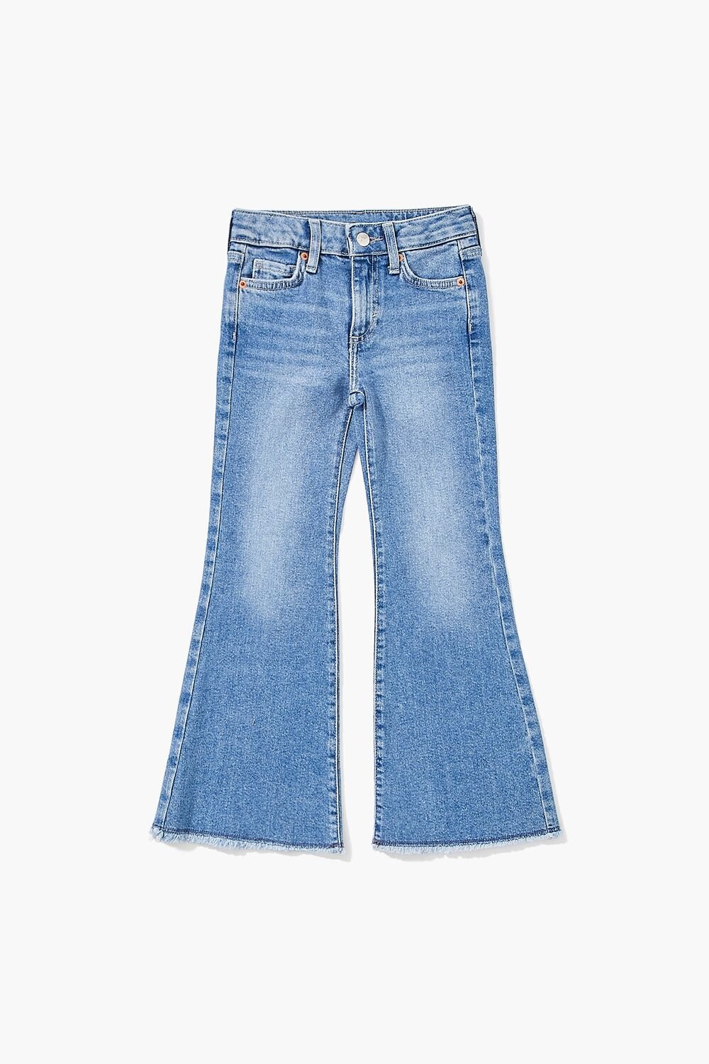 Details Forever 21 Girls – A pair of jeans crafted from recycled cotton blend featuring a stonewash, whiskering, five-pocket construction, zip fly with button closure, belt loops, a flare leg, and frayed hem.Content + Care – 98% cotton, 2% spandex – Machine wash cold Size + Fit – Measured from a Size 7/8 – Inseam: 25′