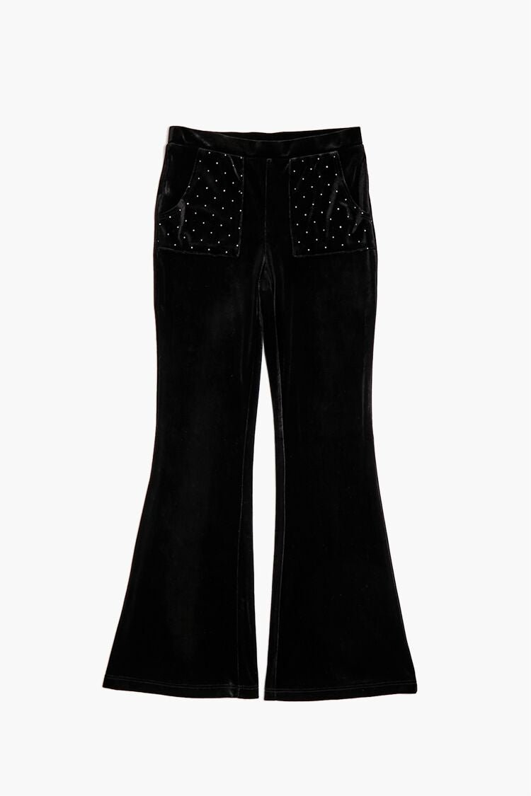 Details Forever 21 Girls – A pair of velvet pants featuring an elasticized mid-rise waist, slanted front pockets with rhinestone embellishments, and flare leg.- Matching top available. Complete the look with 01336872. Content + Care – 93% polyester, 7% spandex – Hand wash cold Size + Fit – Measured from a Size 7/8 – In