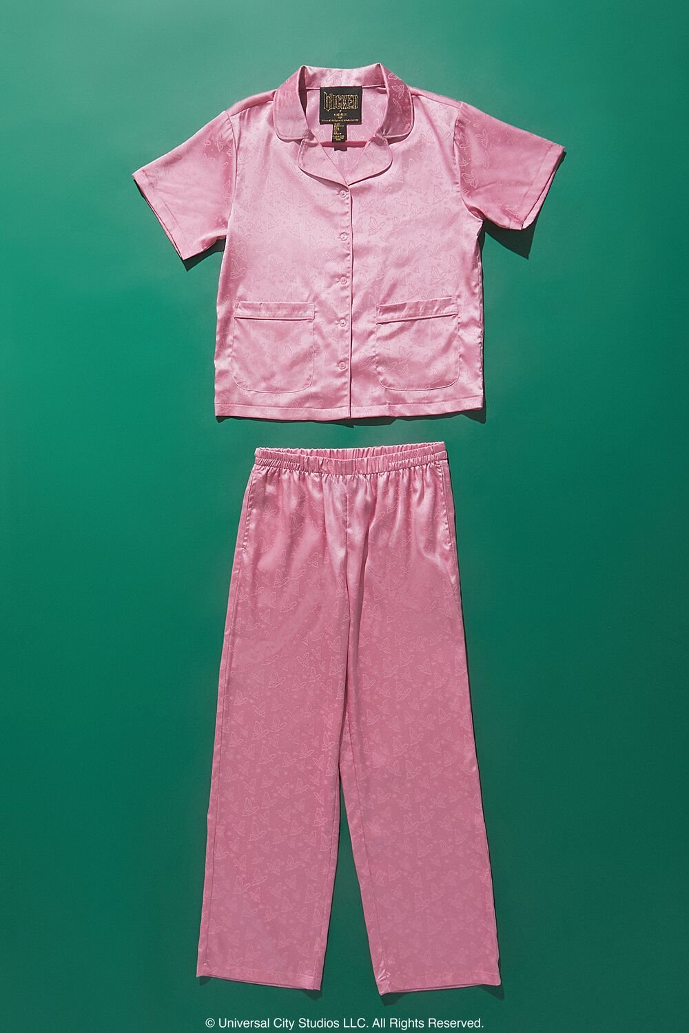 Details Forever 21 Girls – From our Wicked x Forever 21 collection, this satin pajama set features a shirt with short sleeves, notched lapels, button-front closures, front patch pockets, and allover tonal butterfly pattern, as well as a matching pair of pants with elasticized waistband.- © Universal City Studi
