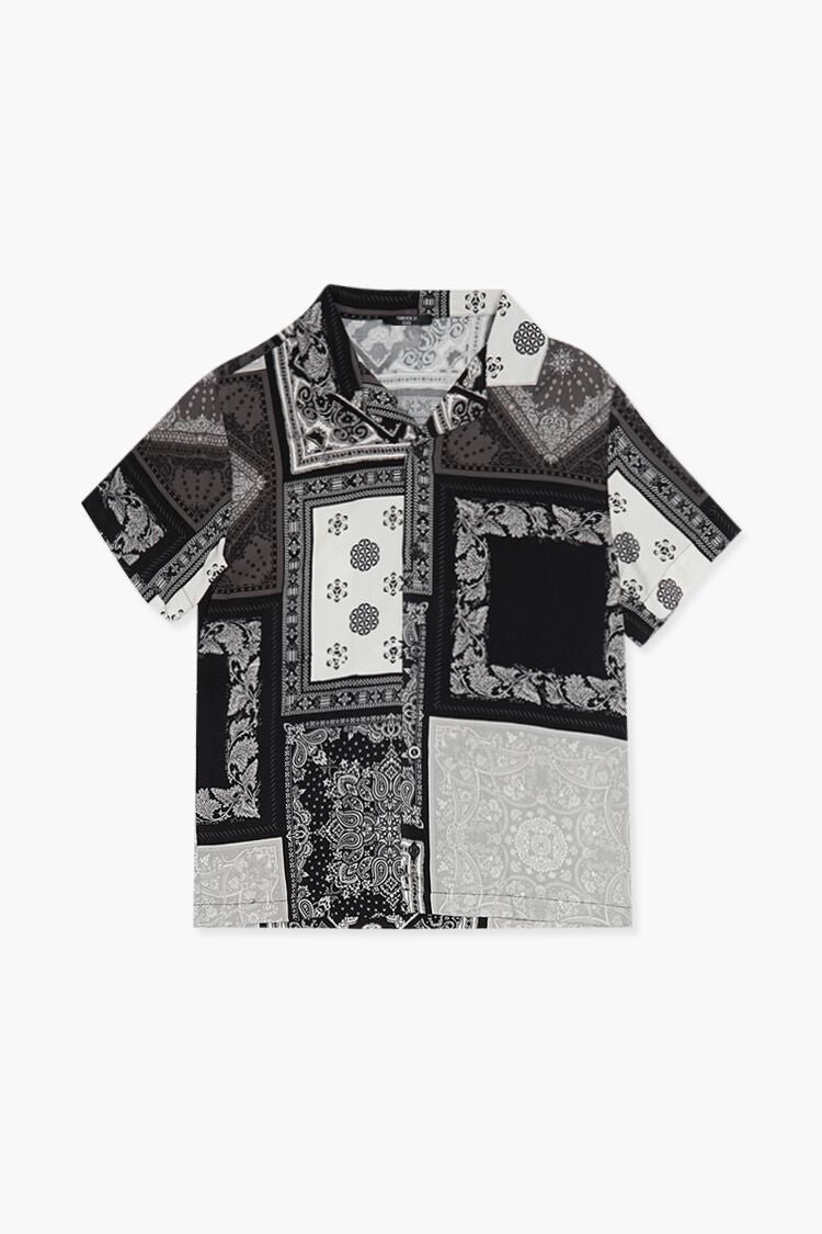 Details Forever 21 Kids – A woven shirt featuring an allover paisley patchwork print, Cuban collar, button-front closures, and short sleeves.Content + Care – 100% rayon – Hand wash cold Size + Fit – Measured from a Size 7/8 – Full length: 21.25′ – Chest: 16.25′ – Sleeve length: 6.5′