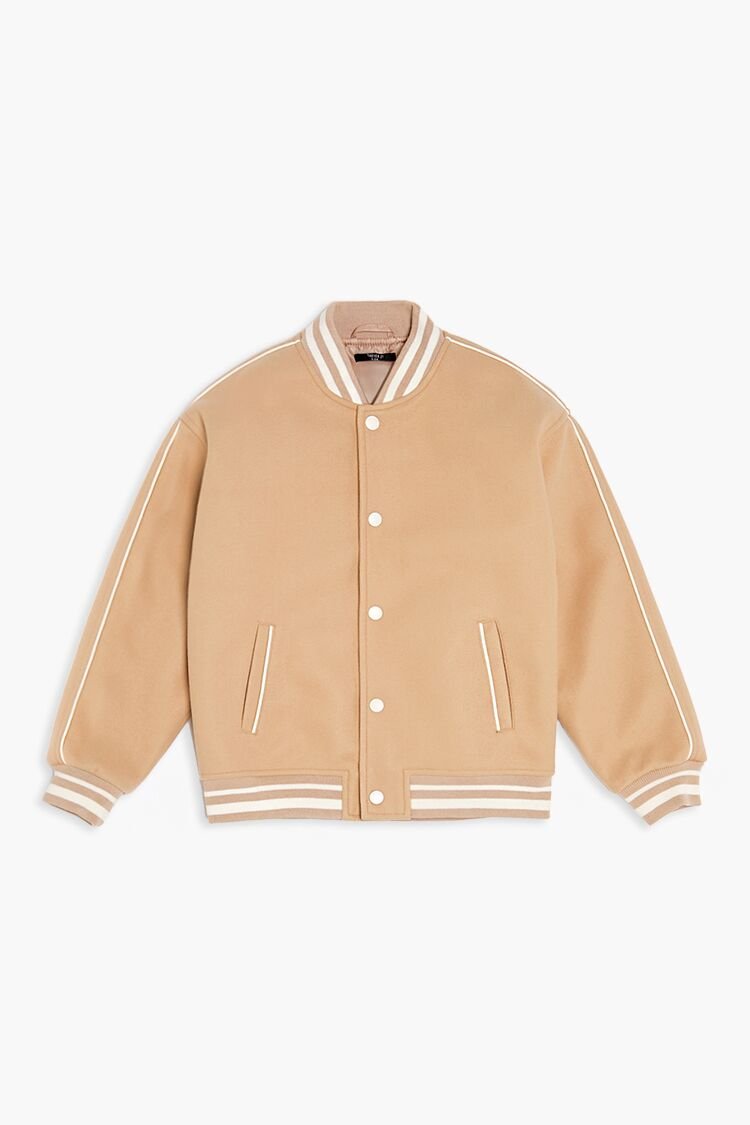 Details Forever 21 Kids – A knit bomber jacket featuring varsity-striped trim, a flat collar, snap button-front closures, slanted front pockets, and dropped long sleeves.Content + Care – Shell & Lining: 100% polyester – Other contents: 99% polyester, 1% spandex – Hand wash cold Size + Fit – Measured from a Size 7/8