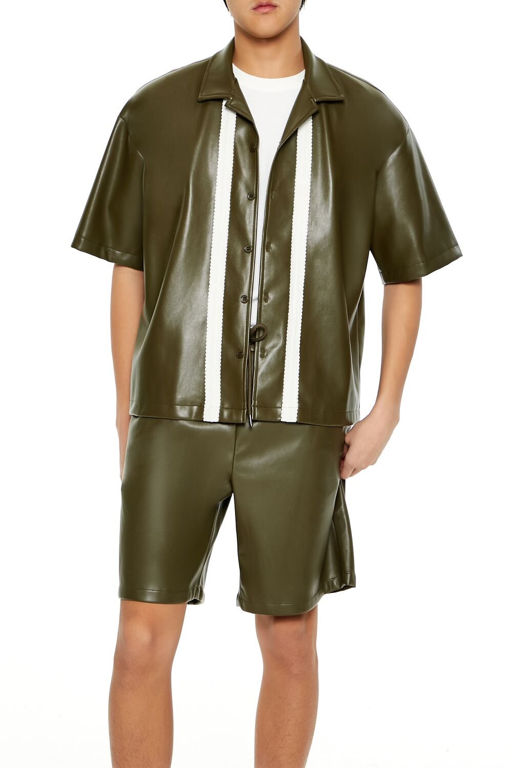Details A faux leather shirt featuring a Cuban collar, striped front design, button-front closures, dropped long sleeves, and cropped hem.- Matching bottoms available. Complete the look with 01348352. Content + Care – Shell: 100% polyester – Other contents: 100% polyurethane – Hand wash cold Size + Fit – Model is 6’1′